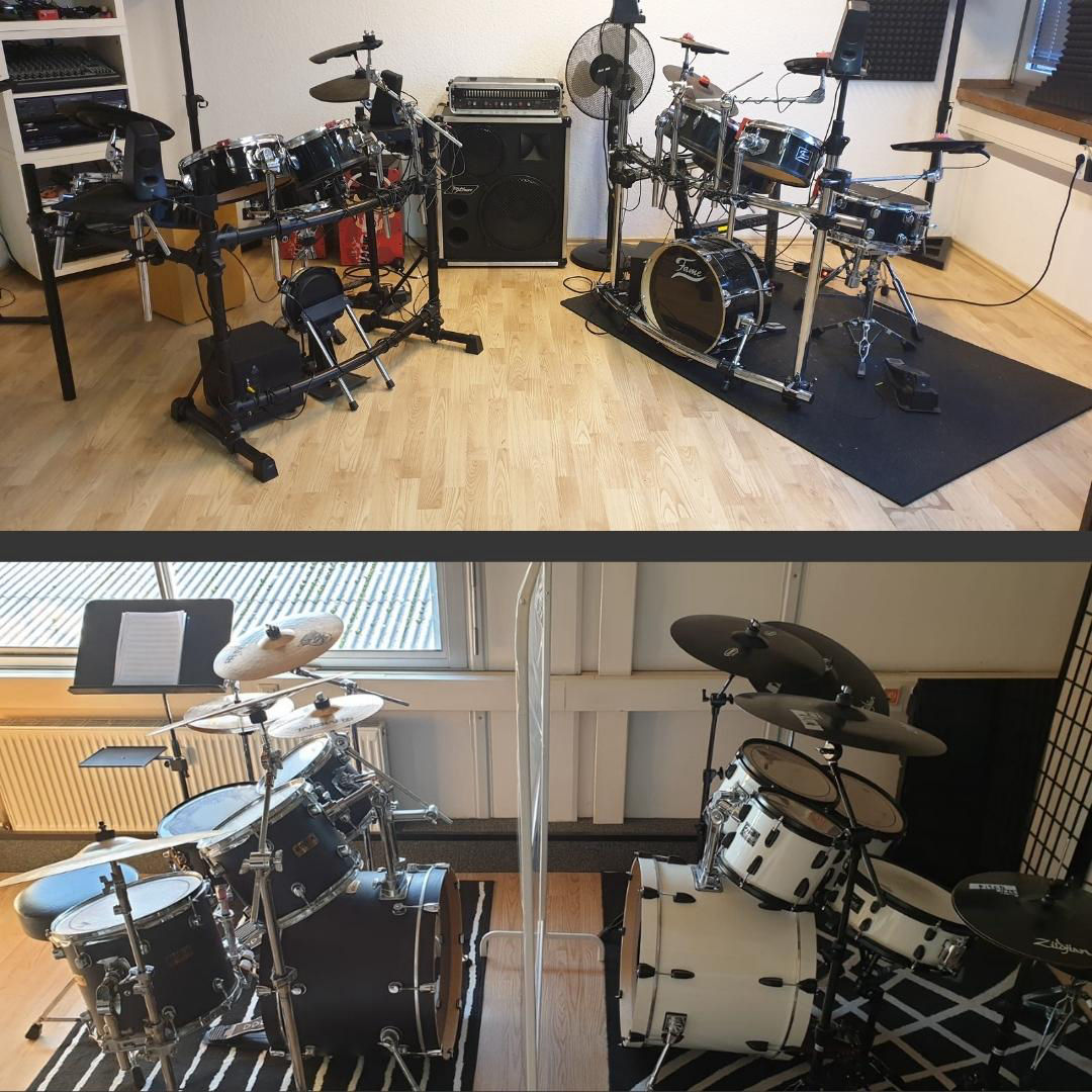Extra für Kinder lehren wir auf speziellen Hybrid Schlagzeugen, das ist eine Mischung aus akustischen Drum-Sets und E-Drums, welche zum einen ein echtes Spielgefühl vermitteln, aber dennoch einen Lautstärkeregler haben, um gegebenenfalls die Lautstärke anzupassen. So ist es bei uns möglich, das Zusammenspiel mit Liedern so zu unterrichten, dass ihr Kind keiner Gefahr von Hörschäden ausgesetzt wird. Selbstverständlich haben wir aber auch einen Raum mit 2 hochwertigen, sich gegenüberstehenden Akustik-Drum-Sets um sich Körper und Stockhaltung sowie Abläufe von Rhythmen oder Fill-Ins besser abschauen zu können.